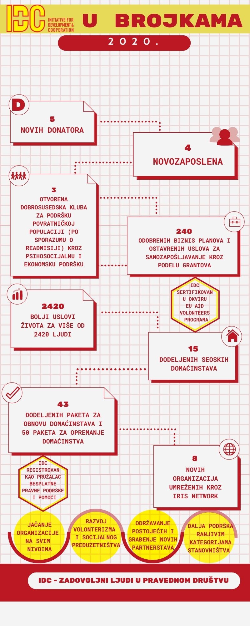 IDC od 2013 ima ulogu generalnog sekretara Mreže socijalne ekonomije Srbije (SENS), koja je trenutno jedina mreža socijalnih preduzeća u Srbiji. Sem ovoga, IDC je inicijator i osnivač i tri socijalna preduzeća – Zadruga (AgroIris), EcoBag i TDI Mladenovac.
