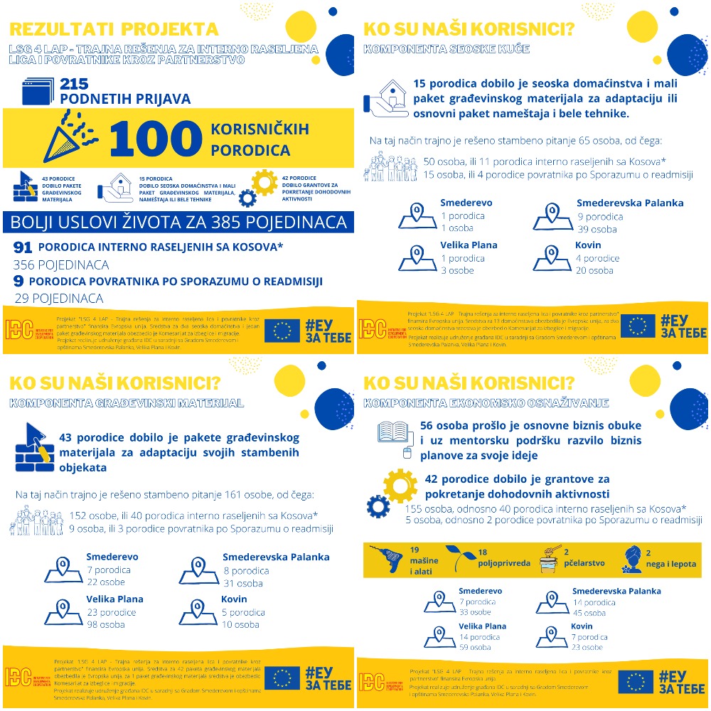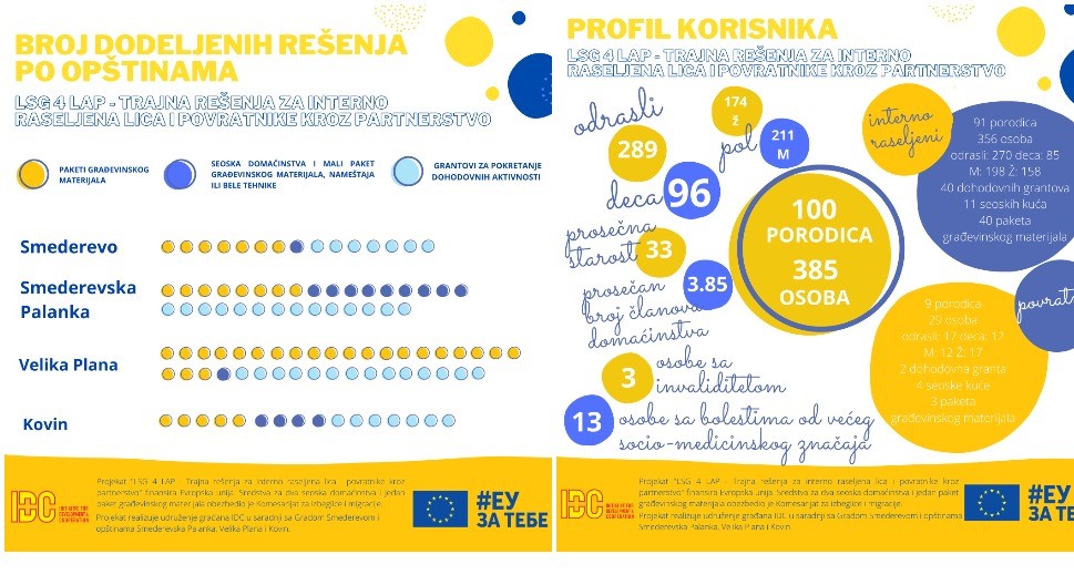 Projekat LSG 4 LAP – Trajna rešenja za interno raseljena lica i povratnike kroz partnerstvo finansirala je Evropska unija preko Delegacije Evropske unije u Srbiji u okviru programa „EU podrška održivim rešenjima za interno raseljene i reintegraciju povratnika” ukupne vrednosti 5,65 miliona evra. Projekat su realizovali IDC, Grad Smederevo i opštine Smederevska Palanka, Velika Plana i Kovin.
